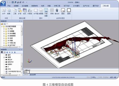 7.二維與三維完全兼容,可直接由三維自動(dòng)生成二維圖形,簡化了地質(zhì)測量采礦各類工程圖表的制作方法,實(shí)現(xiàn)了由幾何建模到開采設(shè)計(jì)建模的跨越。